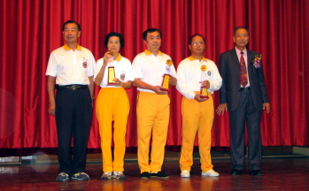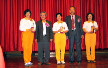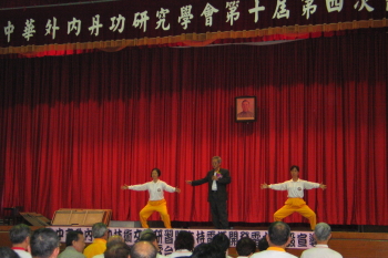 台中市中華外內丹功研究學會第十屆第四次會員大會講座紀要 執行常務理事 劉泰造講述 一、前言 大會主席李理事長、遠從基隆到屏東等各縣市來的指導員,以及各位丹功同道,大家好。 總會黃敏恭理事長非常關心大家,在週五下午五點鐘打電話告訴我,因現在他代理桃園縣縣長,公務繁忙,無法參加今天的大會,特地要我代他向大家問好,並感謝大家一年來的努力,謝謝大家! 今天,很高興能參加臺中市的盛會,我們都是師兄弟,今天我主要是要跟大家共同研究外丹功。 我覺得煉外丹功環境很重要,台語有句話說:「吃穿沒煩惱。」吃穿沒煩惱的人,才能好好的煉外丹功,今天大家能煉外丹功,起碼都是吃穿沒煩惱,因此也都算最幸福的人。外丹功和普通運動不一樣,普通運動只要了解、熟能生巧就可以練好,外丹功是道家的功夫,是性命雙修的功夫,一方面要煉肉體的健康,另一方面,還要進一步煉精神上的健康。 外丹功從古時候就用「口傳心授、耳提面命」這兩句話來傳授。所謂「口傳心授」,就是讓你先了解你所煉的是什麼功夫?要如何煉才能煉得更理想?所謂「耳提面命」,就是煉功的人一定要有人指導。一般而言,外丹功煉好的人很多,但不知道下一步怎麼煉才能提升,才能煉得更好?還有,因為身體的關係,煉了以後,如果還有需要加強的地方,你必須知道如何把不理想的變成理想,所以,煉外丹功靠緣份,有緣份就有機會進一步了解外丹功,這樣,對你身體的健康快樂就有很大的幫助。 最近聽到一則故事,有一位有錢又有權勢的富豪要去參觀埃及金字塔,臨行之前,有一個人告訴他,金字塔是古代王族停柩的地方,停在那個地方的目的是為了要上天堂,那個人又告訴富豪說:「人死後只有二條路:「一條是上天堂、一條是入地獄。」富豪說:「大家都想上天堂啊!」那個人就告訴富豪說:「要上天堂必須有兩個條件,第一、你這輩子必須活得很快樂。第二、你這輩子必須做幫助別人快樂的事。你做到了嗎?」那富豪聽了很生氣,因為他是一位既剝削員工又對員工不好的老闆,因此,他當然無法上天堂。 聽了這個故事,我就認真思考,世間有什麼事,可以讓我們本身快樂?又有什麼事,能幫助別人快樂?相信我講到這裡大家就會了解,我們煉外丹功有先天炁,我們會感覺很快樂,我們進一步幫助別人煉先天炁,也讓別人健康快樂,所以說,煉外丹功的人應當都能上天堂,對不對?(台下響起熱烈的掌聲)。 外丹功要怎樣才能煉得好呢?第一、你要了解外丹功的功架,以及功架裡面包含的細節、功能、如何煉?第二、你還要了解道家的理論。了解之後,還必須認真苦煉才會有功境出現。 外內丹功的總名稱叫「外內丹功」。大師傳功的目的,是要使人人健康快樂,健康的部分是外丹功,快樂的部分是內丹功,外丹功是內丹功的基礎,外丹功先煉肉體健康,再煉內丹功,內丹功是煉精神,用現在的名稱就是精神意識思維活動,也就是一個人的情緒,古時候叫做靈魂,所以內丹功是修煉靈魂的方法,煉陽神出竅,靈魂是永生的,是永遠存在的。理論是這樣,但修煉的方法就很高深,事實上大師都有傳下來,這必須配合大家的功境程度,等待以後有機會再跟大家說明。 外丹功分做兩大部分,就是漢導引和外丹功。事實上,大師將道家的導引、吐納、外丹、內丹、內視、胎息等六大功夫(前三項偏重外丹功,後三項偏重內丹功)中,向下紮根的40%藏在漢導引,向上提升的60%藏在外丹功,所以外丹功跟一般運動不一樣,一開始就必須身心雙修。 二、漢導引 示範 鄭淑鵑 黃美智 (一)漢導引預備式 本式一開始就是靜靜站著,這就是煉身心雙修的功夫。很多人說要統一功架,事實上只要按照口令教學,注意每個口令內涵、細節,功架就自然統一了。煉功心要靜,不要急,不管漢導引或外丹功都有預備式,它主要是使情緒穩定,讓心可以靜下來的功夫。外丹功古時候稱為三才功,也就是天地人合一的功夫,所以,煉外丹功先要學會怎樣讓你三才合一。首先妳必須煉到體內的精氣神合一,才可能煉到天地人合一。 外丹功一開始就靜靜站著,身體不用力,全身放鬆,全身放鬆了,呼吸就自然。一個人是否健康?就看呼吸是否自然?外丹功第一步先用自己的身體去感受體會呼吸是否自然?身體要鬆到鬆柔綿,等到先天炁出來了叫做「活」,像這樣,心靜下來了,呼吸自然了,你才有條件煉精氣神及天地人合一,但煉功雖然不使力,還是要注意自己的生理健康狀況,配合身體狀態煉功,也就是怎樣的身體煉什麼功?絕對不可以貪功。 接下來最重要的是收下巴、頭頂正,還要頭如頂物(這個最重要),頭頂正,脊骨就立起來,脊骨裡面是中樞神經,中樞神經通大腦,但是絕不可意頂百會,意頂百會絕對煉不好外丹功。外丹功有幾句話:『有意為虛,無意為至虛,煉至虛成至真。』這句話很清楚的告訴我們不能意頂百會。你要先知道什麼叫「虛」,很多人都知道外丹功一定要悟,悟要靠智慧,而且要靠煉功,只要煉到某一種程度,用自己的身體感受體會,煉出功境,產生智慧再去悟,先悟出什麼是虛,沒有至虛怎麼能成至真,所以,你一意頂百會,功就煉不出來了。 下巴一收,兩眼平視,下巴收好了才兩眼平視,它就自然調和五臟之氣,道家有一句話叫「道法自然」,大師所傳的法都是自然功法,什麼叫自然功法?就是功架正確,效果就出來。像他們兩個靜靜站著,下巴一收,兩眼平視,五臟之氣就調和,情緒就